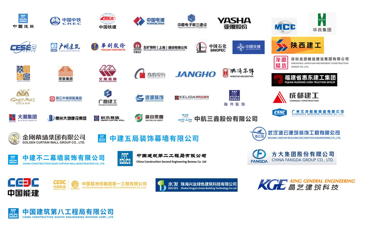 公司參建了諸多大型項(xiàng)目工程,如港珠澳大橋、珠海國(guó)際航展、深圳國(guó)際會(huì)展中心、廣州白云機(jī)場(chǎng)、西安全運(yùn)會(huì)場(chǎng)館、成都東安湖大運(yùn)會(huì)場(chǎng)館、樂(lè)山奧體中心、洛陽(yáng)奧體中心、增城富士康廠(chǎng)房、惠州中海油、陽(yáng)江核電站、珠三角各地鐵線(xiàn)、高鐵站、廣西桂林機(jī)場(chǎng)、廣西柳州文化廣場(chǎng)、四川成都天府機(jī)場(chǎng)、海南海口美蘭機(jī)場(chǎng)、西安絲路會(huì)展中心、惠州北站等等。與中國(guó)建筑、中國(guó)中鐵、中國(guó)鐵建、中國(guó)電建、中國(guó)交建、中國(guó)中冶、中國(guó)能建、廣東建筑、廣西建工、廣州建筑等大型國(guó)有企業(yè)下屬公司及江河幕墻、金螳螂裝飾等各大建筑裝飾、幕墻裝飾公司達(dá)成長(zhǎng)期友好合作關(guān)系。